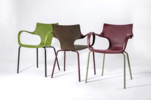 materiali che impattano l’eco-sistema. Erbi è proposta in 4 gusti diversi. Ogni gusto è un profumo che corrisponde alla fibra vegetale utilizzata e al suo colore naturale. Erbi Chami nasce dal recupero degli scarti della produzione di camomilla per uso cosmetico. La camomilla viene recuperata e sterilizzata, lavorata in microgranuli e sanificata. Per realizzare Erbi Chami, Stilfibra® ha scelto un PP rigenerato caricato camomilla, che permette di ridurre la componente plastica ottenendo un materiale più naturale e profumato con ottima performance tecnica, offrendo un’esperienza di utilizzo che richiama la natura. Erbi Moka coniuga polimero e-Pergamino, lo scarto della produzione di caffè, recuperato e sterilizzato, lavorato in microgranuli e sanificato. La fibra, grazie alla sanificazione e all’attivazione, risulta libera da metalli pesanti e batteri. Erbi Wini propone il colore e i profumi tipi delle vinacce, recuperate da distillerie e aziende vinicole del Veneto. Gli scarti vengono recuperati e sterilizzati, lavorati in microgranuli e sanificati. La fibra, grazie alla sanificazione e all’attivazione, risulta libera da metalli pesanti e batteri. Erbi Miski utilizza invece il Miscanto, una pianta perenne fra le cui virtù ecologiche spicca una straordinaria capacità di assumere anidride carbonica, in misura quadrupla rispetto al normale. Grazie al processo che preserva le qualità della fibra organica, questa CO2 (detta CO2 biogenica) rimane intrappolata nel materiale, riducendo così la quantità di carbonio di origine fossile contenuta nei tradizionali materiali plastici.