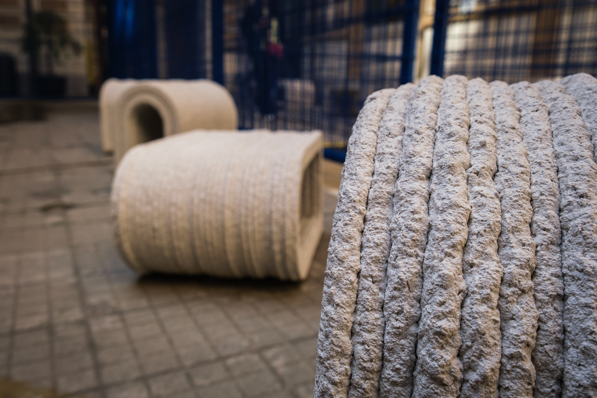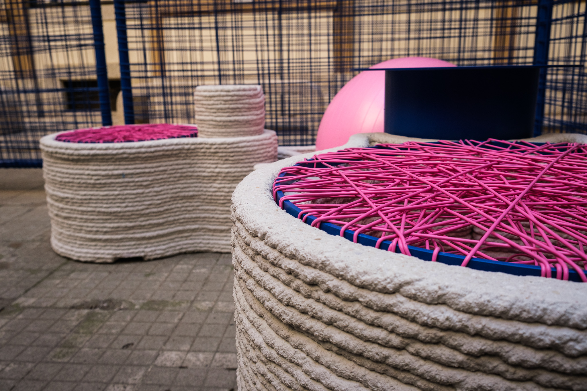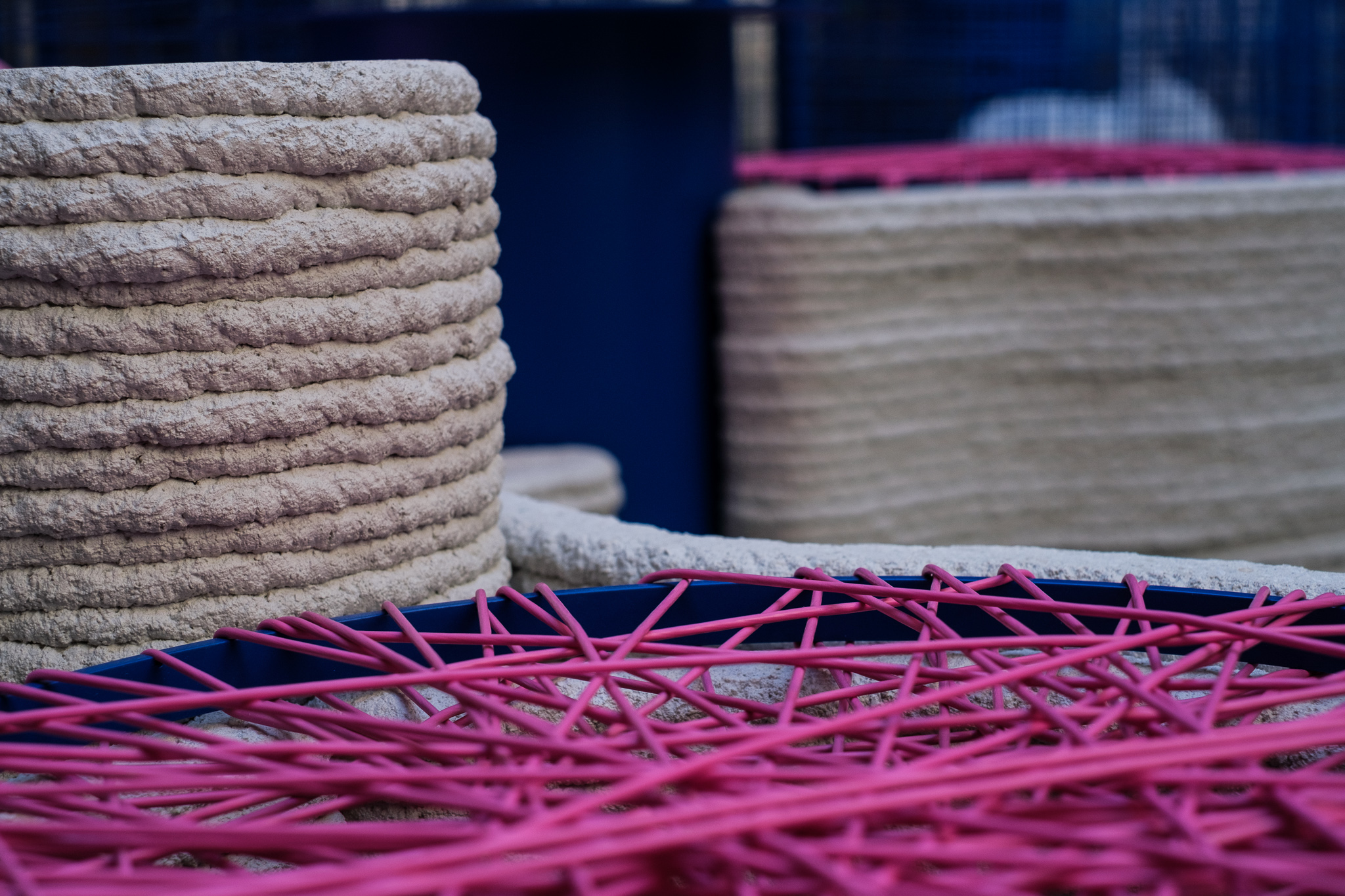 “Il filo che diventa racconto, cucitura, legame, il filo che unisce, che diventa tutt’uno con la pietra, che lo accoglie e lo esalta, il filo come elemento caratterizzante, la vista si interroga, il tatto non mente, armonia di opposti che si fondono”, descrive il designer. Ha dialogato con i nuovi pezzi della collezione ORU (in giapponese “intreccio”) che consacra il cambiamento della percezione del PVC, che muta e si sostanzia, in opere di upcycling tra arte e design, con mini ORU portafiore e ORU separatore di ambienti che si aggiungono agli elementi decorativi da pareti qui rappresentati da una composizione di ORU mezze lune. Le produzioni erano custodite nel cuore dell’allestimento all’interno del primo cortile SIAM in via Santa Marta 18, uno degli headquarters 5VIE. Ricorrente la manipolazione di un materiale di scarto del PVC – 100% riciclabile – un “sottoprodotto” di prova del materiale plastico per testarne le performance qualitative, che entra in connessione con materiali eterni, preziosi e si fa arte, si fa decoro, si fa arredo e viene reso infinito come ogni pezzo da collezione che trova il suo posto nel mondo. Completavano l’allestimento, le sedute progettate e realizzate in stampa 3D in cemento con il riutilizzo di macerie e rifiuti da demolizIone e costruzione ad hoc per l’occasione in partnership con la start-up Centauroos, comun denominatori il territorio, l’innovazione, la sostenibilità e il designer!