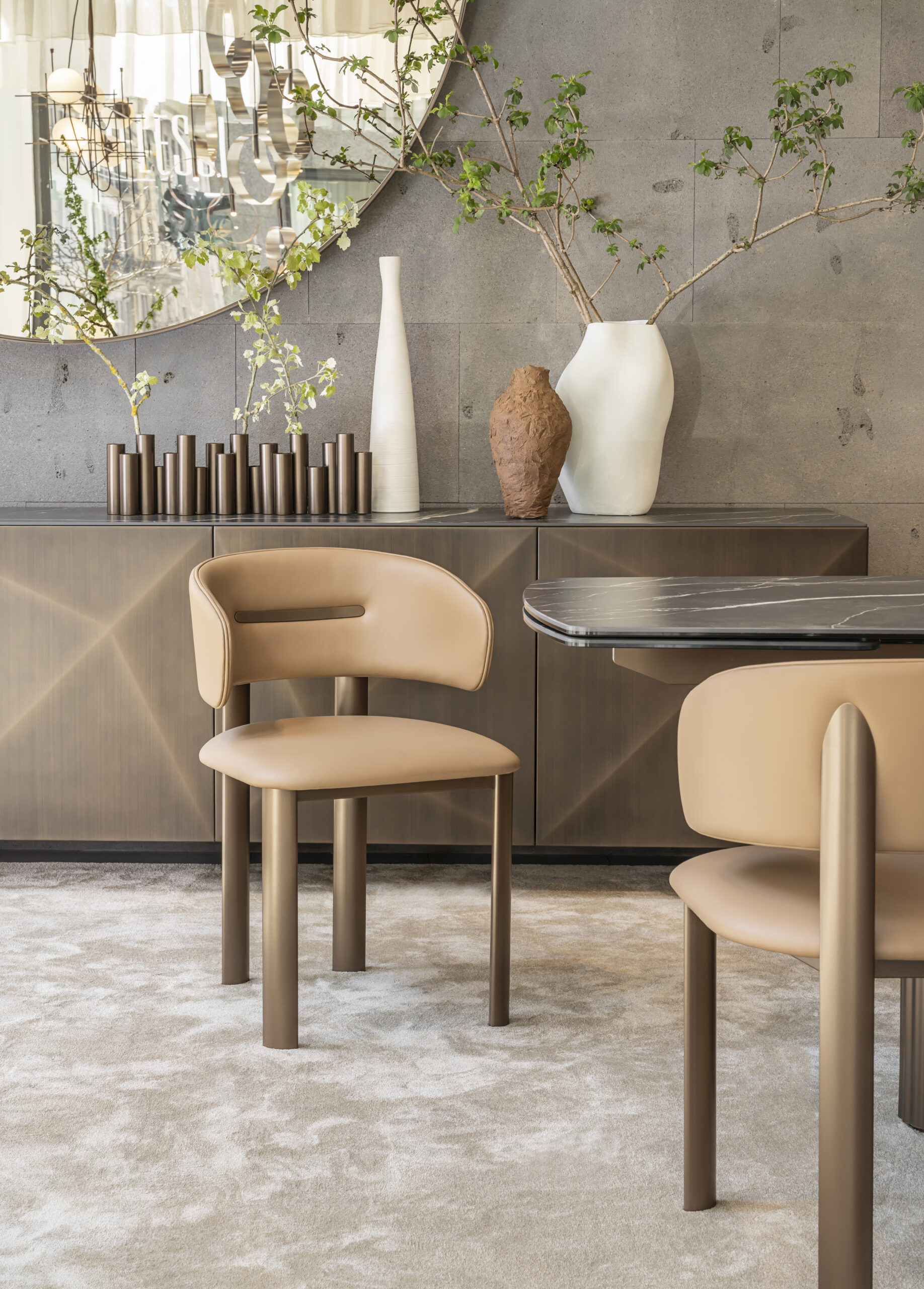 Anche quest’anno, l’azienda ha celebrato la tradizione sartoriale italiana applicata al mobile, facendosi portavoce di una costante ricerca tecnica e stilistica che da sempre pone al centro l’individuo, il suo benessere e il suo desiderio di personalizzazione. Lo spazio ha ospitato lo scenografico allestimento firmato da Bruno Tarsia, noto architetto ed interior stylist che da anni collabora con il brand. Il setup si è svelato in un gioco di moquette, tappeti e tendaggi morbidi e materici dalle colorazioni neutre che hanno accompagnato i visitatori alla scoperta delle numerose novità. Questa scelta cromatica ha voluto valorizzare ed esaltare le cromie bronzo delle collezioni in mostra, fil rouge di uno stile sempre più sofisticato e contemporaneo, eco di comfort e glamour discreto. La kermesse ha accolto il pubblico in un’atmosfera avvolgente e lo ha accompagnato in un percorso vocato al racconto di sartorialità, artigianalità e saper fare italiano. La gamma sedie è quella che in assoluto meglio interpreta la pregiata sartorialità del marchio. Al Fuorisalone 2025 vengono presentate quattro nuove collezioni, tutte firmate Carlesi Tonelli Studio: Soffio, Bacio, Nova Lounge e Velvet.